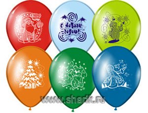 Высококачественный шар из натурального латекса. Ассорти из 10-12 цветов (в случайном соотношении), одного типа - пастель - матовый оттенок цвета. Шары с двусторонним шелкографическим рисунком (6 дизайнов на тему "Новый год" в пакете) с большим полем печати.