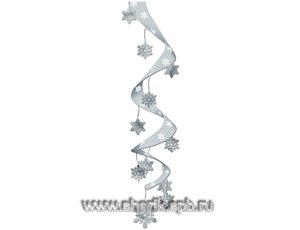 Декоративное новогоднее украшение интерьера. Вертикальная спиральная подвеска из серебряной фольги со свисающими с нее снежинками.