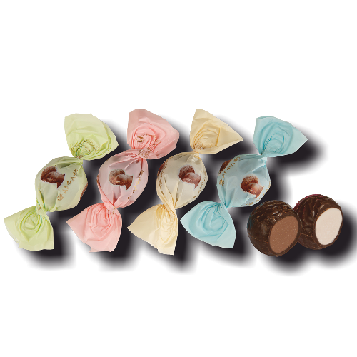 Конфеты сферической формы в шоколадной глазури со сливочной начинкой со вкусами: "Трюфель", "Вишня", "Дюшес", "Заварной крем" .