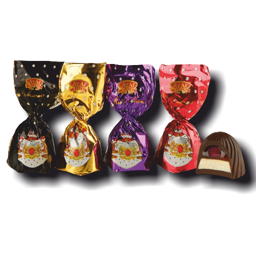 Конфеты куполообразной формы в шоколадной глазури с комбинированной сливочной начинкой с цельной сушеной вишней в фруктовом сиропе, с натуральными вкусами: "Вишня", "Вишня черный лес", "Ром с вишней", "Вишня в коньяке", "Бренди". НОВИНКА!!!