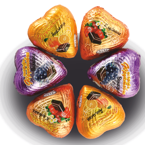 Конфеты в фрме сердечек в шоколадной глазури с желейной начинкой со вкусами: , "Банан", "Вишня", "Малина", "Чёрная смородина", "Яблоко", "Клубника", "Абрикос", "Клюква".