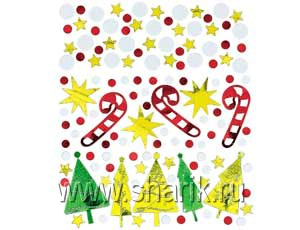 Разноцветное новогоднее конфетти выполнено в трех дизайнах: белые круги-снежки, золотые звездочки и красные круги; блестящие красные салазки ивосьмиконечные рождественские звезды; салатовые и зеленые елочки,золотые звездочки, красные и белые кружки.