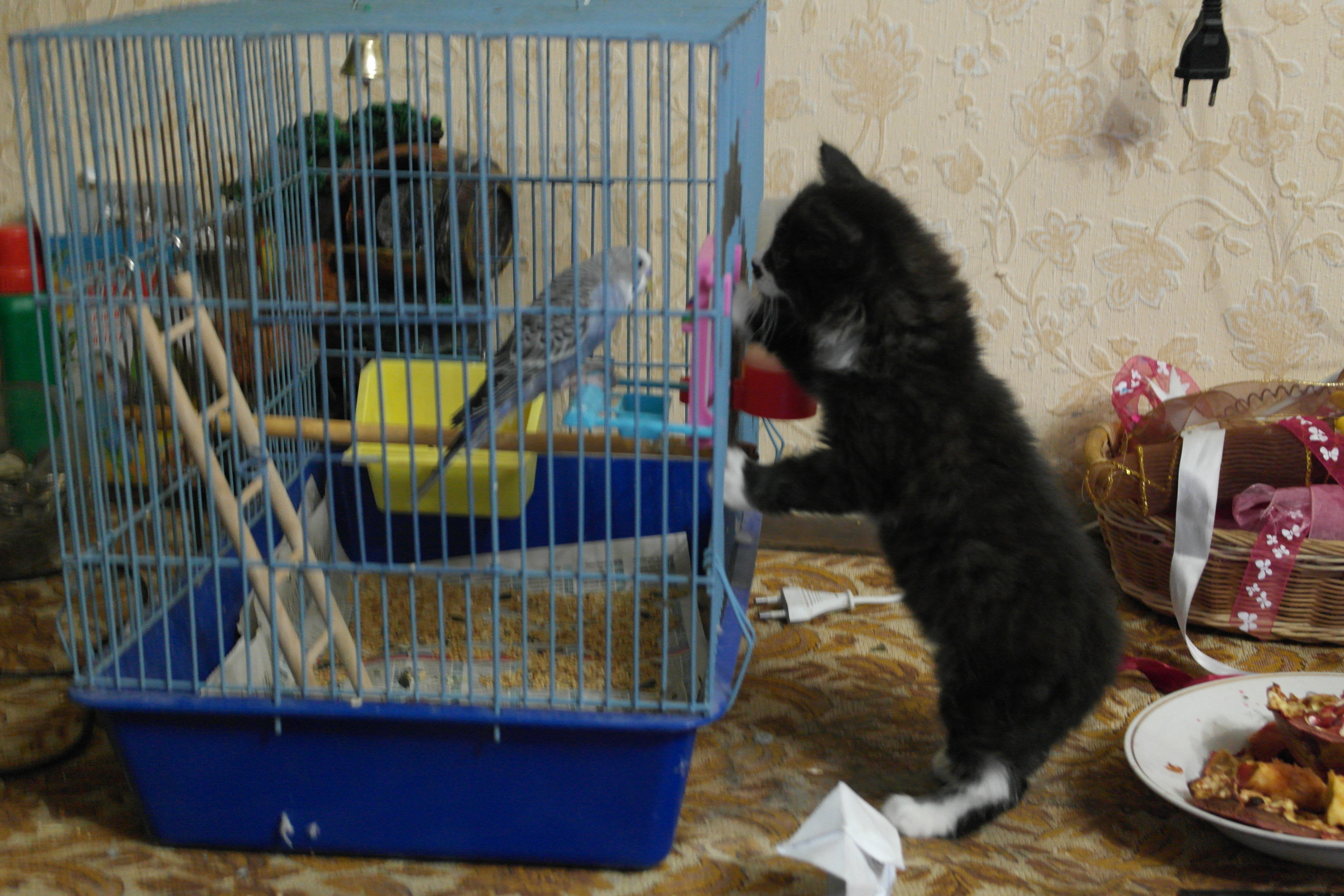 Моя кисуня в таком возрасте жила в клетке с попугаем (в галерее видео есть))))