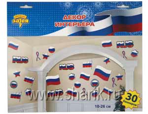 Комплект из 30 двусторонних картинок-баннеров в стиле государственнойсимволики: флаги, ленты, звезды, щиты, надпись RUS, круглые эмблемы.Размер баннеров от 10 до 26см. Россия,вперёд!