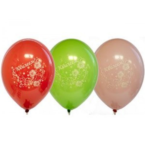 Высококачественный шар из натурального латекса. Ассорти из 10-12 цветов (в случайном соотношении), одного типа - пастель - матовый оттенок цвета. Шары с двусторонним шелкографическим рисунком с Юбилеем! С большим полем печати.