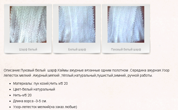 Шарф пуховый белый, серый ажурный (ручная работа,спицы) 50*150 см 1,500.00
