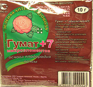 Гумат+7 - содержит 60-65% гуматов и 7 важнейших микроэлементов (Fe-0,4.%, Cu-0,2,%, Zn-0,2%, Mn-0,17,%, Мо-0,018%, Со-0,02%, В-0,2%, N-1,5%) в виде комплексных соединений с гуминовыми кислотами. Хорошо растворим.